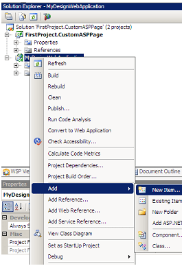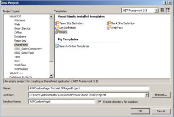 In Visual Studio 2008, create a new project with Empty Project Template; In the Name text box type ASPCustomPage.Tutorial.SPPagesProject and in the Solution Name type ASPCustomPage Press OK.