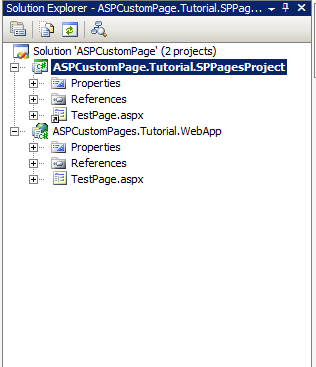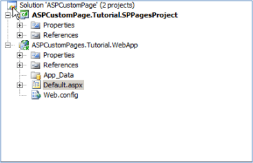 In the ASPCustomPages.Tutorial.WebApp project, delete the Default.aspx file, the App_Data (Optional) folder, and the Web.config file, you will get something like: