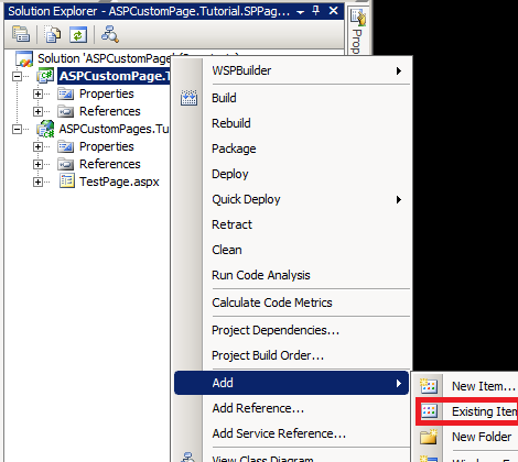 Add the TestPage.aspx file to the ASPCustomPage.Tutorial.SPPagesProject project as a link to the existing item. To link a file from another project, right-click the ASPCustomPage.Tutorial.SPPagesProject project , then click Add Existing Item, navigate to the file you want to add, and then click Add As Link in the Add drop down list, full story are detailed in the figure below:![]()
