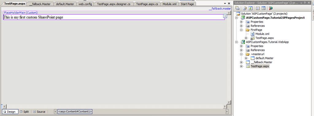 Drag and drop a label to the TestPage.aspx for a test, name it “This is my first custom SharePoint page“
