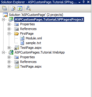 Delete the sample.txt, Keep Module.xml Drag and drop the “TestPage.aspx Link page” into the FirstPage Folder, in other words make the solution look like the following:![]()