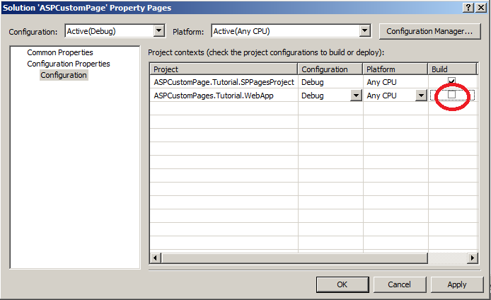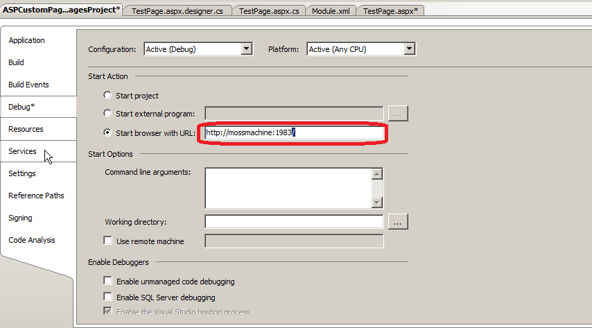 To deploy the solution change the Start browser with URL in the ASPCustomPage.Tutorial.SPPagesProject properties page in the debug pane:![]()