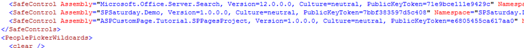 <SafeControl Assembly="ASPCustomPage.Tutorial.SPPagesProject, Version=1.0.0.0, Culture=neutral, PublicKeyToken=e6805455ca617aa0" Namespace="ASPCustomPage.Tutorial.SPPagesProject" TypeName="*" Safe="True" />